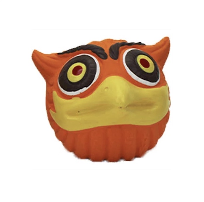 Cabeça de Corujinha tipo bolinha de látex com cerca de 08 cm de altura e apito com som agudo.