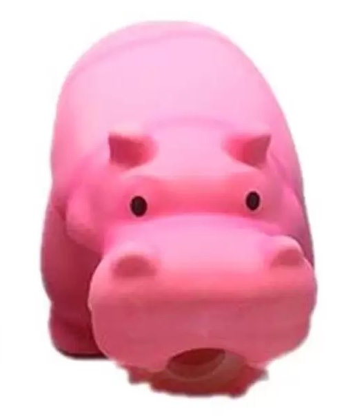 Hipopotinho de latex com cerca de 10 cm de altura. Contém apito com som grave. Cores sortidas